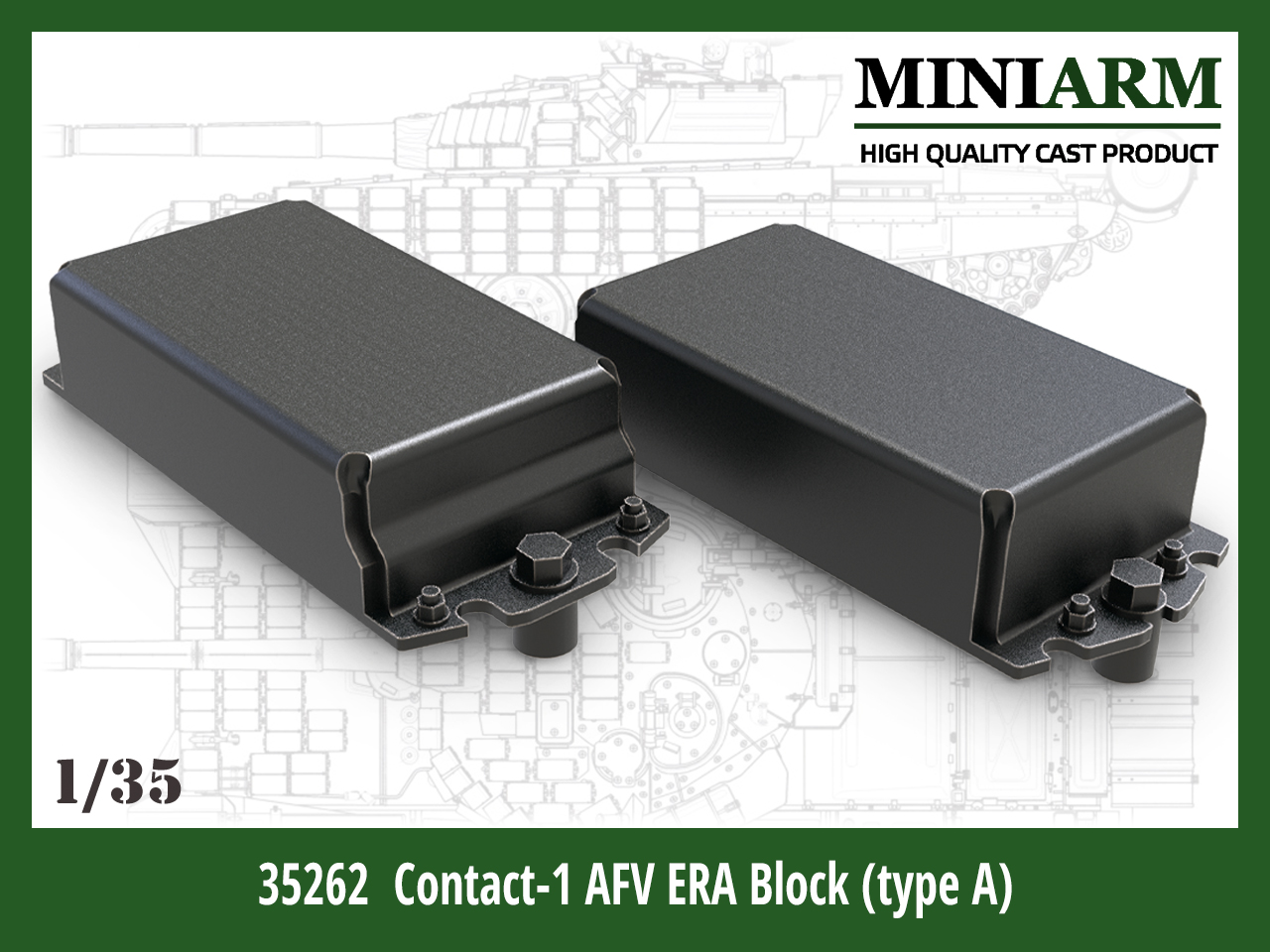 1985年に当時のソビエト軍戦車T-64、T-72、T-80などに装着された第一世代のERA(爆発反応装甲)コンタークト-1 4S20を再現したディテールパーツです。長方形の金属ケース、前後で異なる取り付けボルト位置なども忠実にモデル化しました。