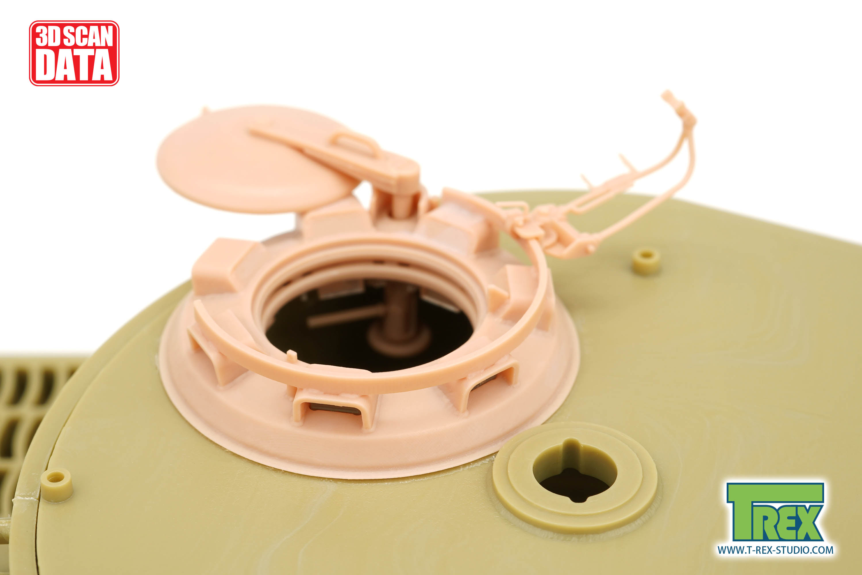 3Dスキャンデータを用いた設計により、1944年2月から生産が開始された後期生産車の車長キューポラを正確に再現します。キューポラ本体は対空機銃架レールまで一体成型ですが、ハッチは別パーツで開閉選択が可能、機銃架も別パーツで精密に再現、ペリスコープも透明レジンパーツで構成されています。