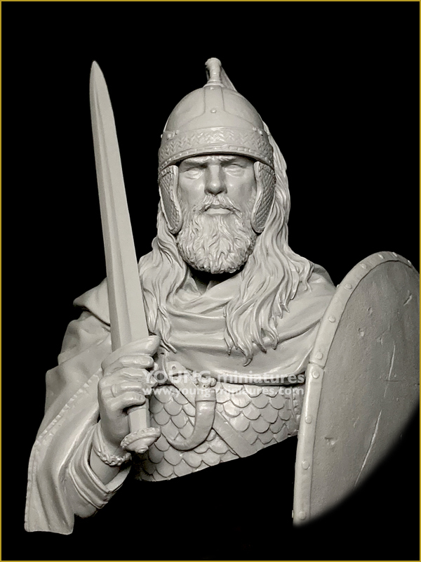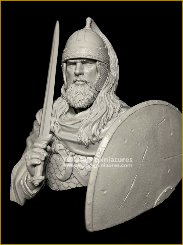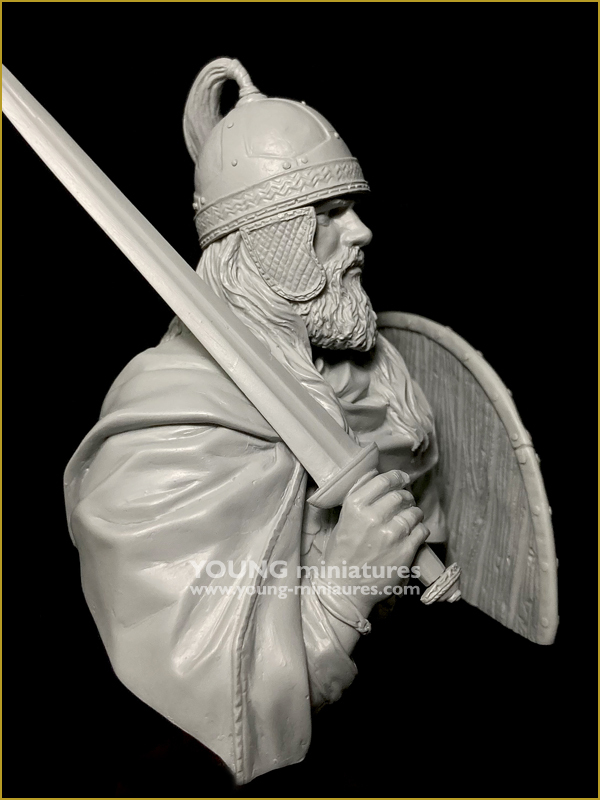 右手に敵の盾をも切り裂く両刃の長剣、左手に部族のシンボルなどが描かれた丸形の盾を持ち、頬に防護板が付いたシュパンゲンヘルム型ヘルメットに身を固めた戦士を、生き生きとした表情とポージングでモデル化しています。
