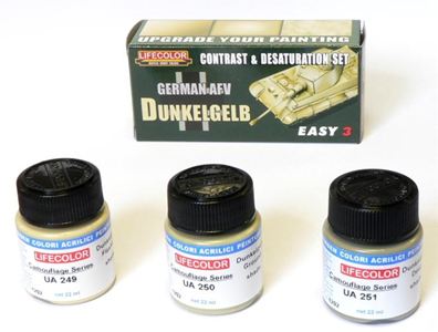 アクリル塗料のため下地が 透けて上塗りすることで 深みが出るのも利点です。 第一弾はドイツ軍戦車の基本で あるダークイエローの3色セット。 リーズナブルな価格も魅力 です。