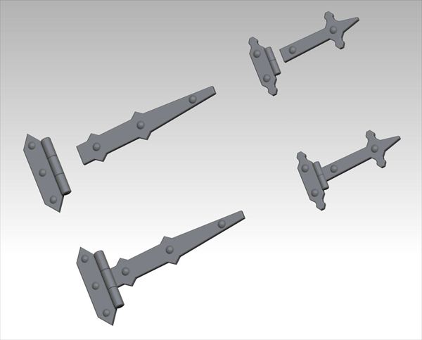 木製のドアや門などに使われる古い鉄製のヒンジを再現する3Dプリント製アクセサリーパーツセットです。大小2種類、ヒンジとアームが一体式と別体式、各4個ずつ合計24個をセットします。