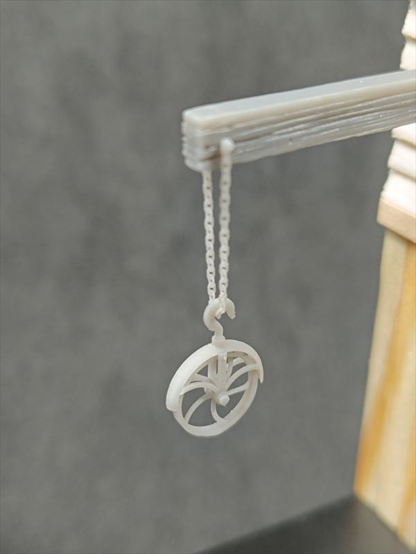 建物の壁から突き出した木製の支持架からチェーンで吊り下げられた滑車(プーリー)を再現する3Dプリント製アクセサリーパーツです。