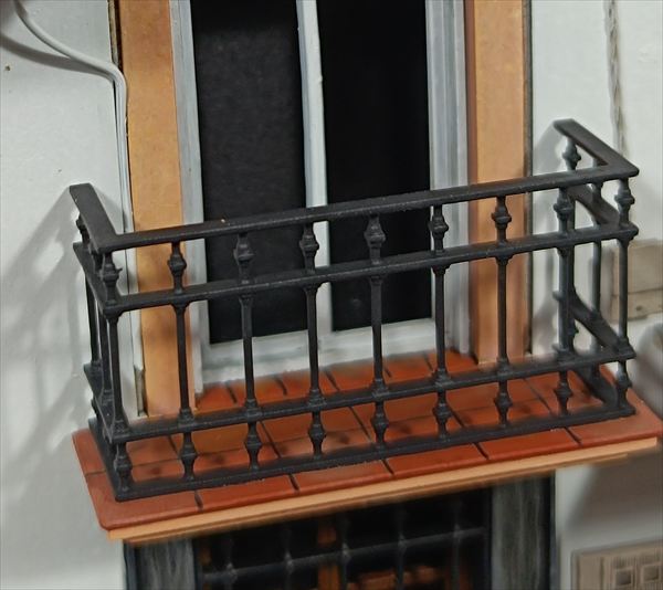 ヨーロッパの家屋に見られる鉄格子の柵付きバルコニーを再現する3Dプリント製アクセサリーパーツです。サイズは6.2cm×3.5cm×2cmです。