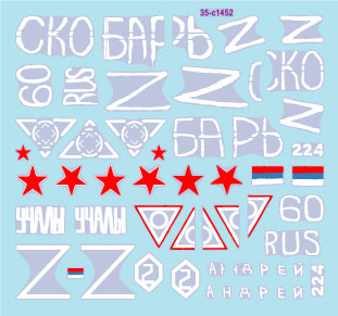 2022年からのロシアのウクライナ侵攻で、ウクライナ領内に進攻したロシア軍のT-90M主力戦車のマーキングを収録しています。全5種類をセレクトし、一部のマーキングはオプションも用意されています。