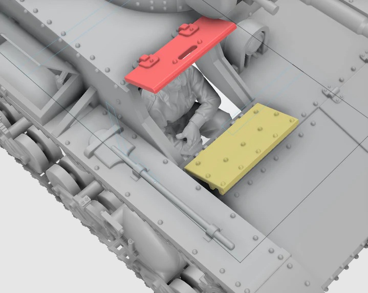キットは12k高解像度の3Dプリント技術により精密に再現されています。操縦手ハッチは開閉選択式、工具箱は開状態と閉状態の2種類をセット、車長と操縦手の計2体の乗員フィギュアも付属します。