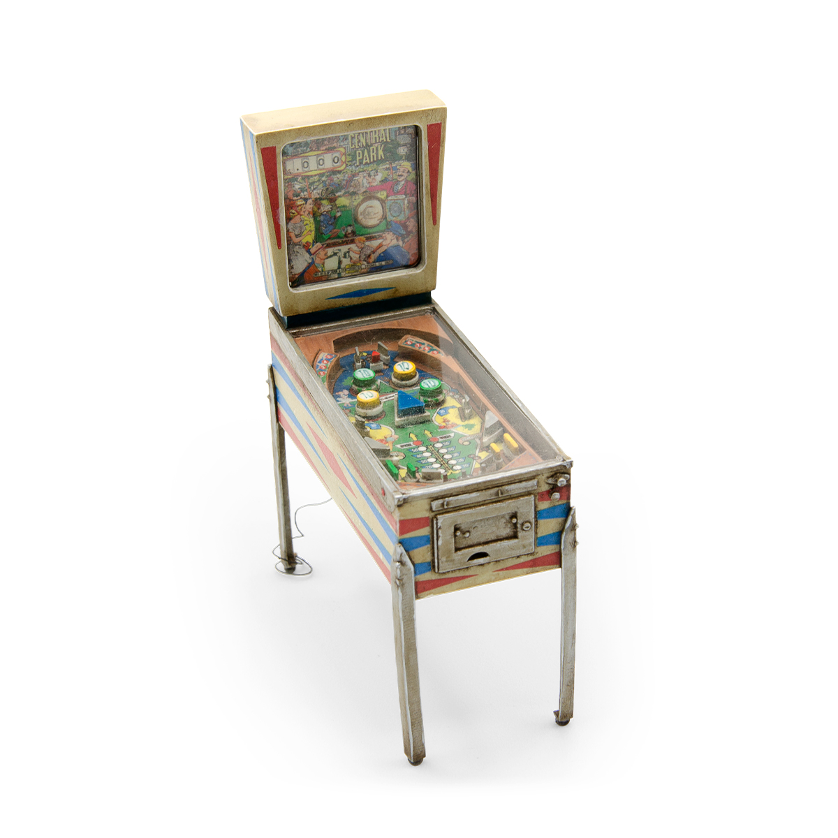 ピンボールマシン「セントラルパークフリッパー」は、1966年にゴットリーブ社から発売され、3,100台が製造されました。これのゲームデザインはエド・クリンスキー氏、アートワークは著名なイラストレーターであったロイ・パーカー氏が手掛けました。パーカー氏はピンボールマシンの古典的なデザインを確立した人物です。