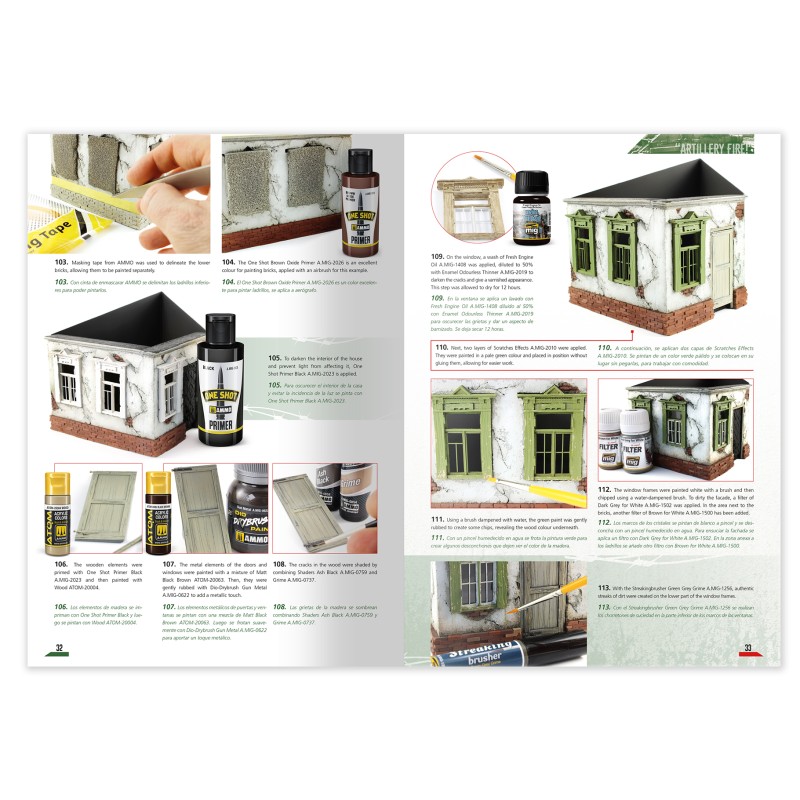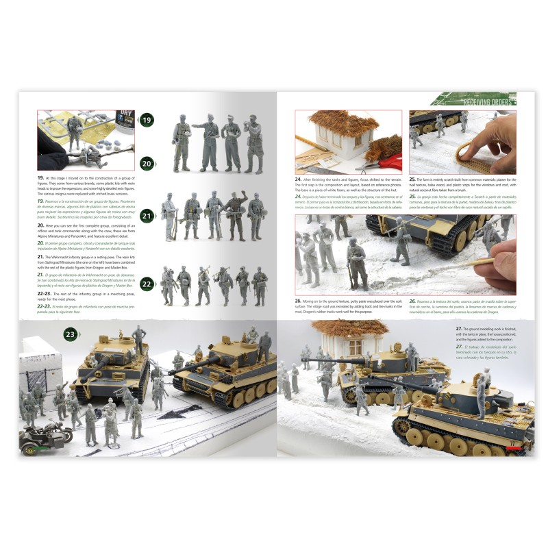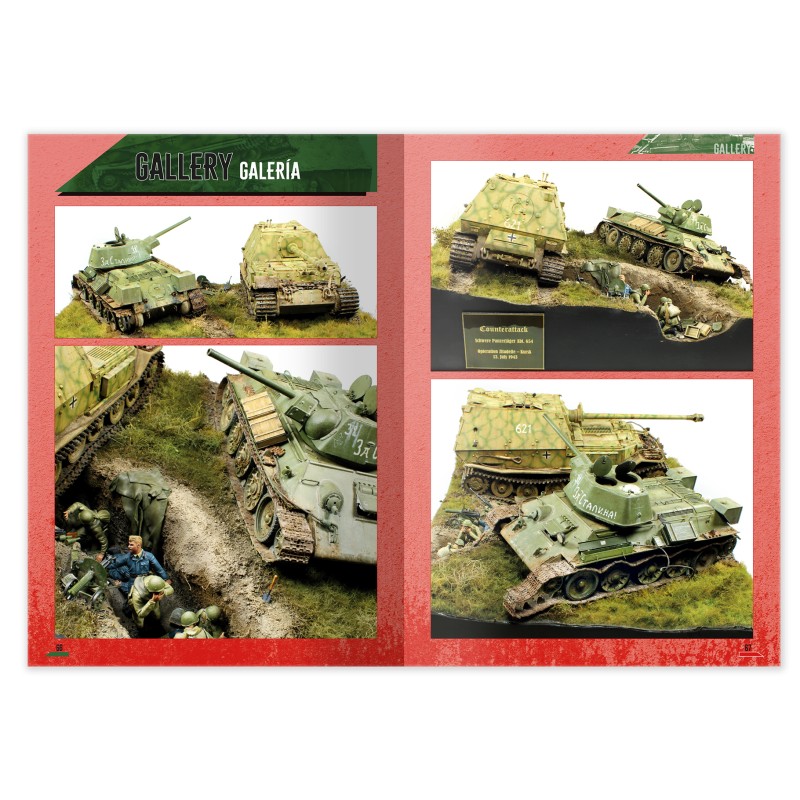 ヴェスペ自走砲、フェルディナント、タイガーI、III号戦車、III号突撃砲、T-34/76、SU-122、KV-1 など、戦場を彩る名車両を完全収録。建物や塹壕、橋、水場の作り方、フィギュアやアクセサリーの塗装例も詳しく紹介しています。