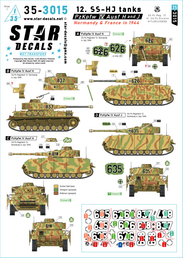 1944年、フランスのノルマンディーで戦ったドイツ第12SS装甲師団ヒトラーユーゲントに所属するIV号戦車H型およびJ型のマーキングを収録します。H型3種類、J型1種類、計4種類をセットしています。またスペア番号やステンシルもセットされ、複数のオプションを選択して製作することも可能です。