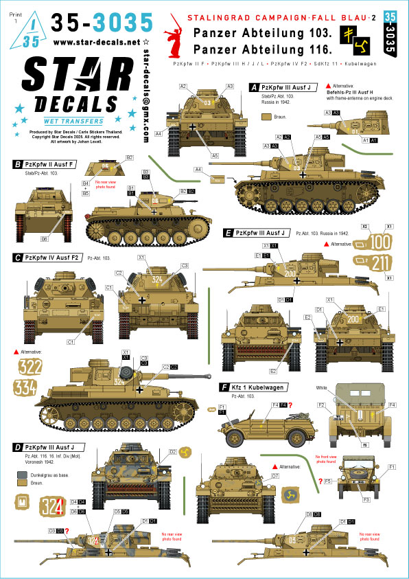 STAR DECALS[SD35-3035]1/35 WWII ドイツ スターリングラード戦線 ブラウ作戦#2 第103戦車大隊/第116戦車大隊のII号戦車F型/III号戦車H/J/L型/IV号戦車F2型/Sd.Kfz.11/キューベルワーゲン [ご注文締切日 1月30日(金)3月入荷予定]