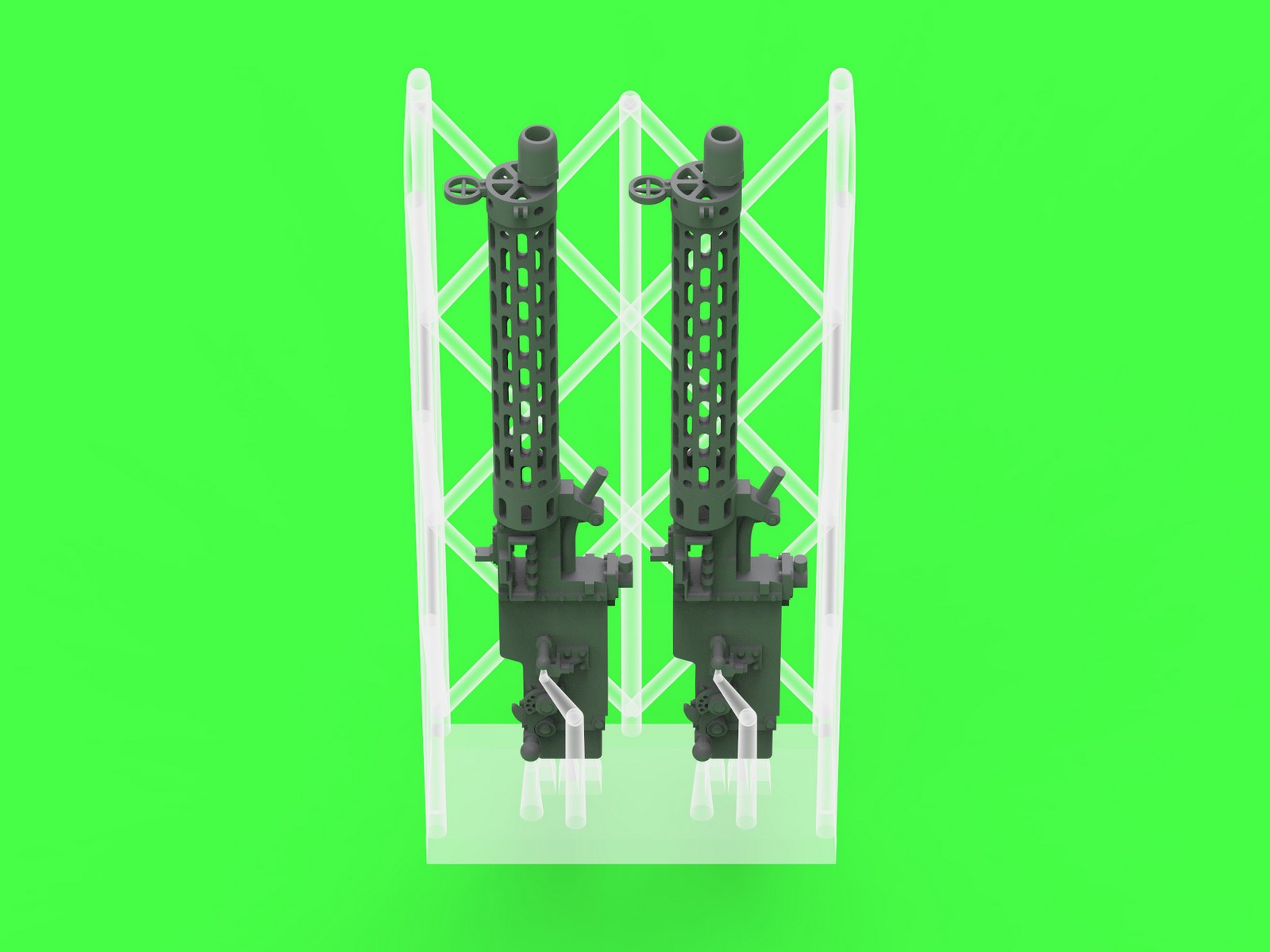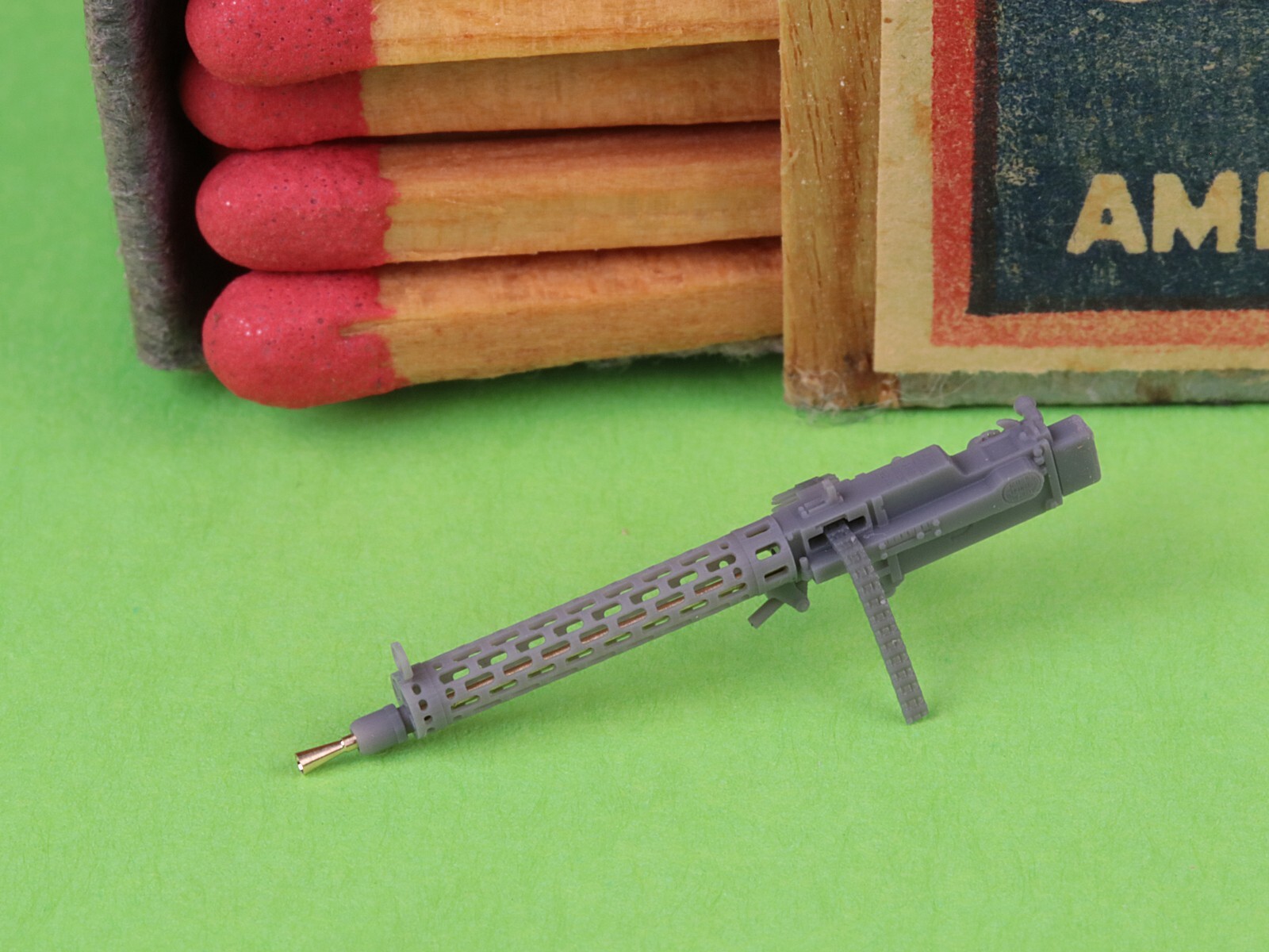 右側面の装填ハンドルが短いタイプをモデル化しています。機銃本体と放熱筒、弾帯は3Dプリント製、銃身は真鍮挽き物製をセットします。
