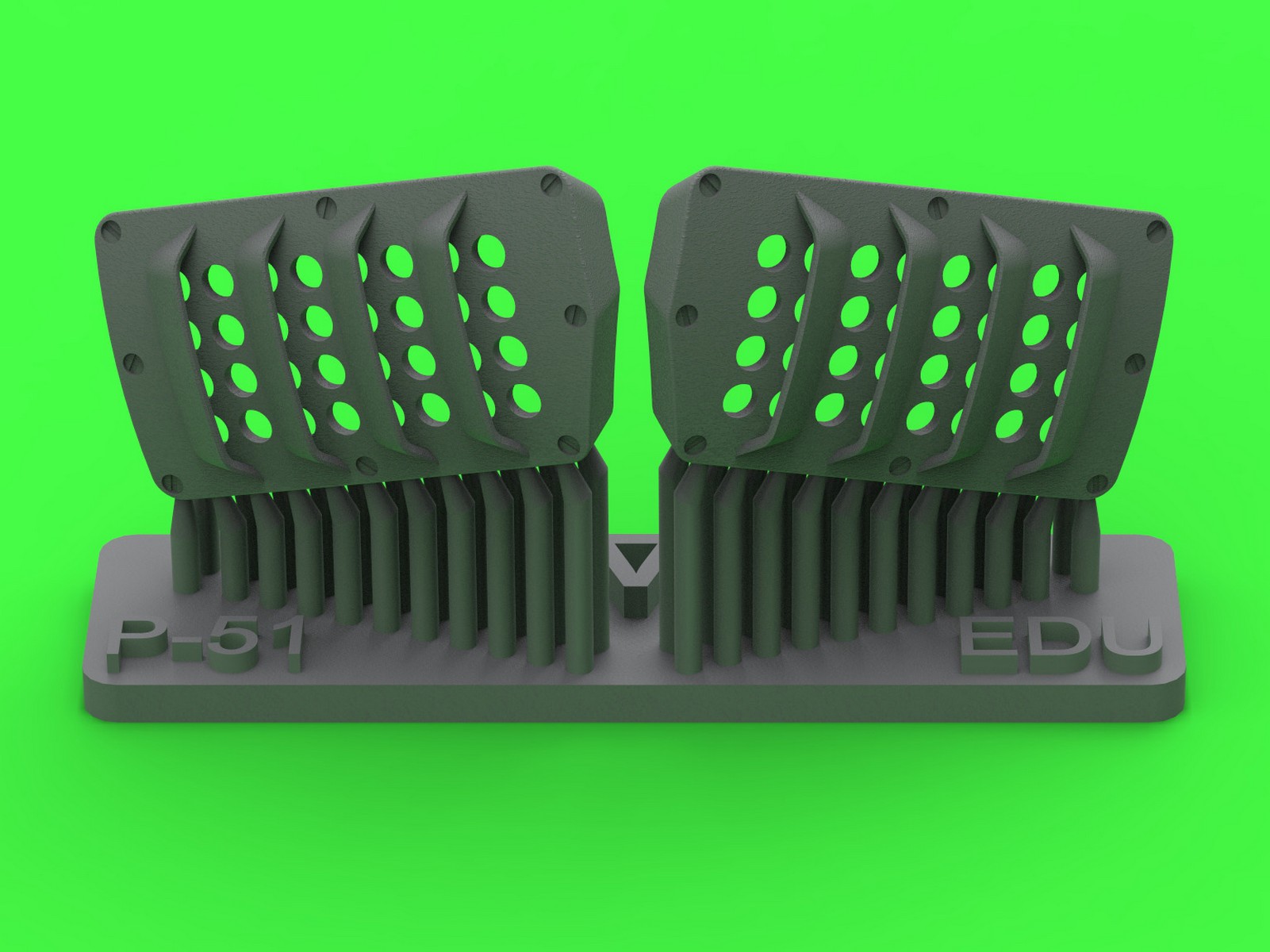 第二次大戦アメリカ軍のP-51ムスタング戦闘機の機首下部左右のキャブレターエアフィルターカバーパネルを再現するディテールパーツです。エデュアルド製キットに対応します。