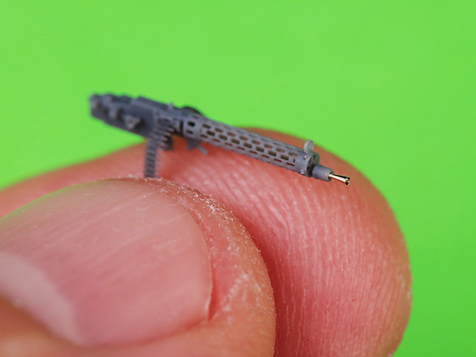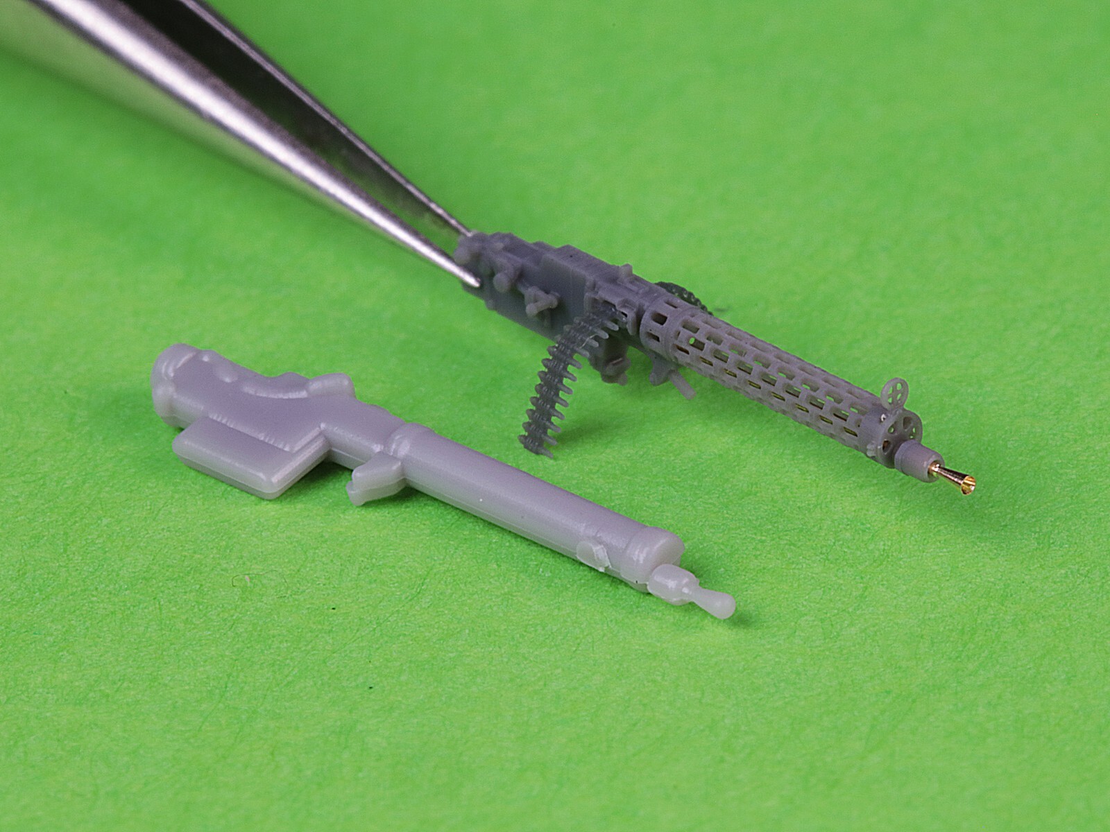 右側面の装填ハンドルが短いタイプをモデル化しています。機銃本体と放熱筒、弾帯は3Dプリント製、銃身は真鍮挽き物製をセットします。