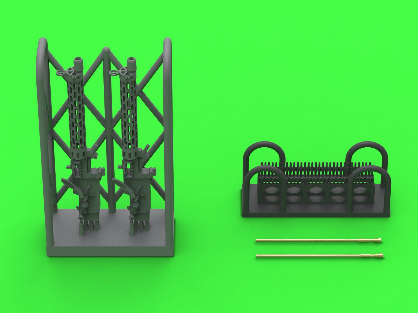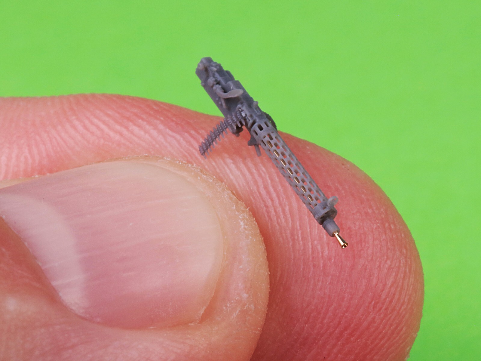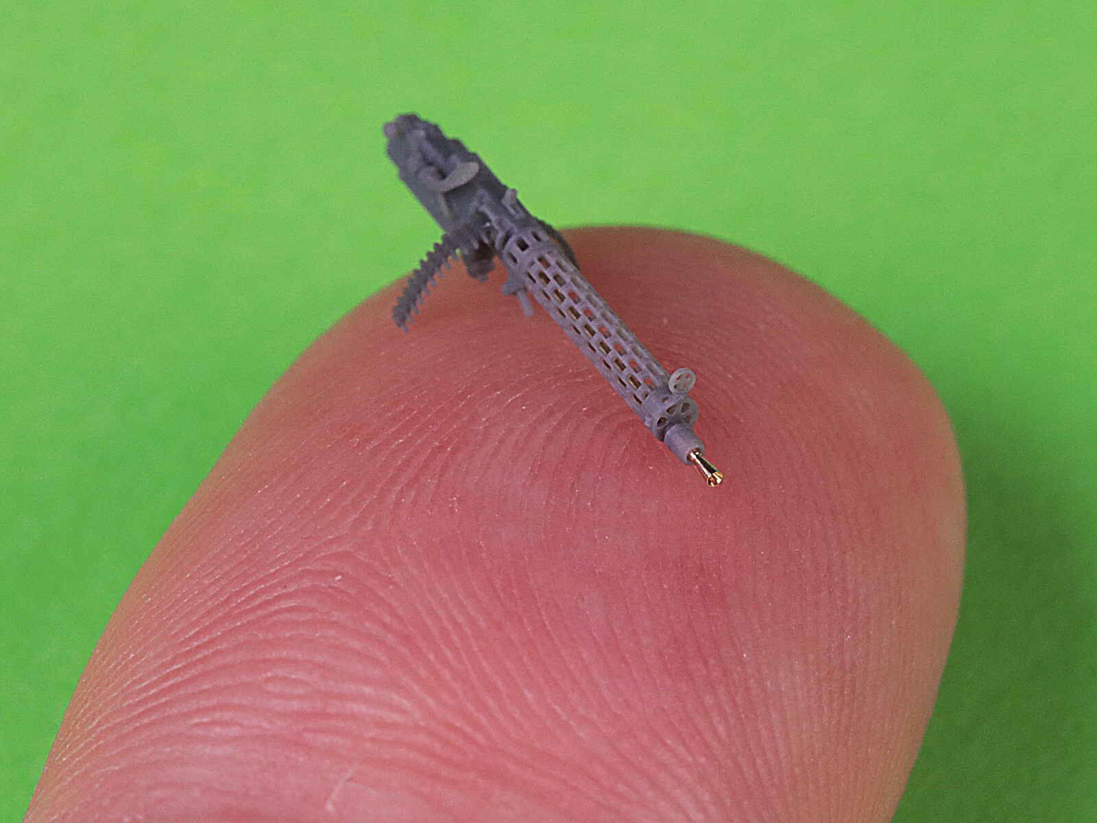 右側面の装填ハンドルが長いタイプをモデル化しています。機銃本体と放熱筒、弾帯は3Dプリント製、銃身は真鍮挽き物製をセットします。