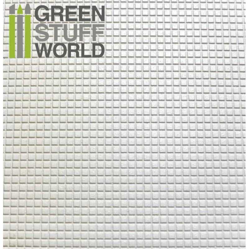 丈夫で加工しやすく、切断や接着も簡単。小さな正方形模様(2×2mm) が施されており、床、天井、壁、金属板、石材など、様々な建築ディテールの再現に最適です。