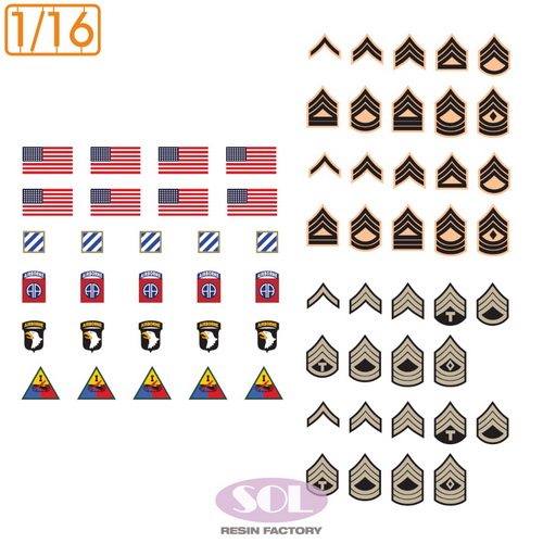 一等兵から先任曹長国籍を示す階級章、星条旗、所属部隊を示す第1機甲師団、第82空挺師団、第101空挺師団などの部隊章をセットしています。