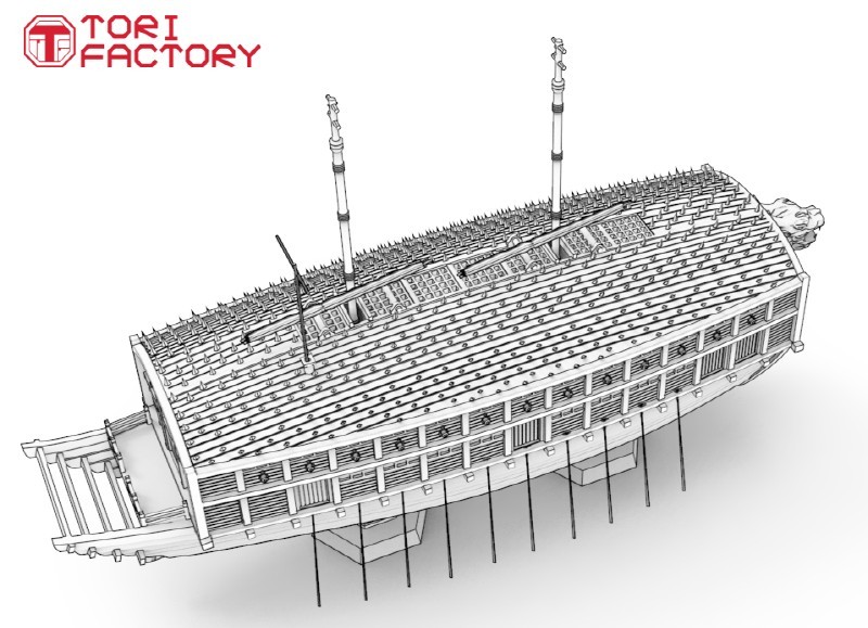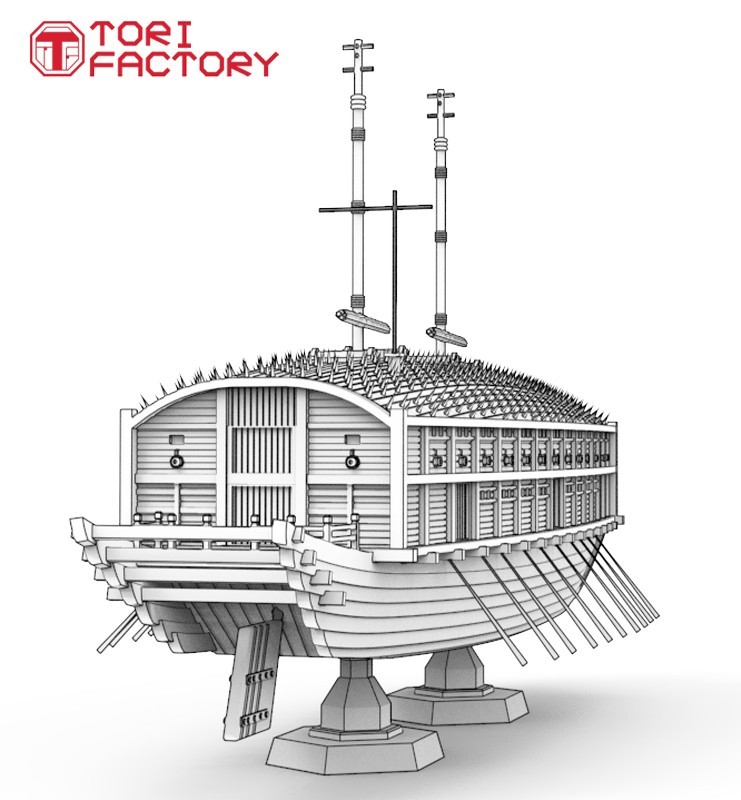 3甲板の亀甲船をベースに、トリファクトリーのデザイン解釈による歴史的な軍艦モデルとして再現します。パーツは高精度の3Dプリント製で、組み立ても容易です。オールと旗はエッチングパーツで再現。マーキング用のデカールも付属します。