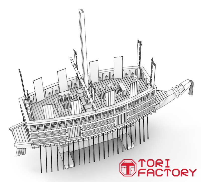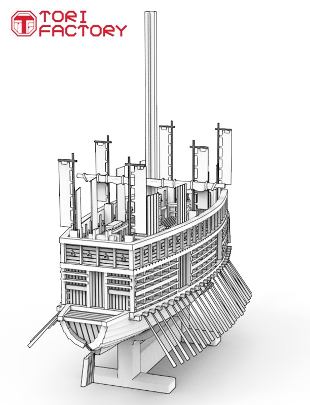 劇中の仕様をベースに、トリファクトリーのデザイン解釈による歴史的な軍艦モデルとして再現します。パーツは高精度の3Dプリント製で、組み立ても容易です。オール、旗、乗船板はエッチングパーツで再現。マーキング用のデカールも付属します。