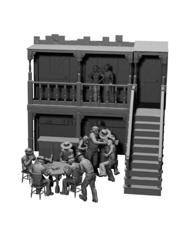 「ウェスタン・サルーン」と呼ばれる西部劇で一般的な酒場を再現したストラクチャー、バーカウンター、丸テーブル、椅子などのアクセサリーに、家具類に、賭けトランプに熱中する者、殴り合いのケンカをする者、バーテンダーに酒を求める者、2階の廊下から階下の喧騒を眺める女たちなど、計12体のフィギュアをセットします。