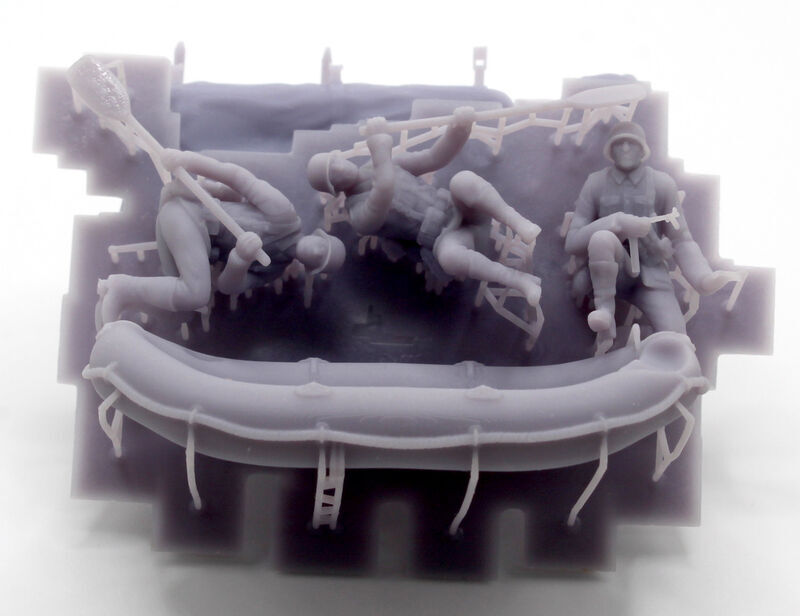 ゴムボートは水上で航行中の状態を再現、前後にオールを持った兵士が各1体、中央に機関短銃を持った下士官が1体、計3体のフィギュアをセットしました。