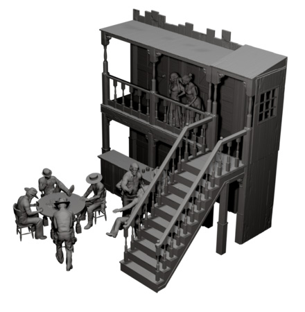 「ウェスタン・サルーン」と呼ばれる西部劇で一般的な酒場を再現したストラクチャー、バーカウンター、丸テーブル、椅子などのアクセサリーに、家具類に、賭けトランプに熱中する者、殴り合いのケンカをする者、バーテンダーに酒を求める者、2階の廊下から階下の喧騒を眺める女たちなど、計12体のフィギュアをセットします。