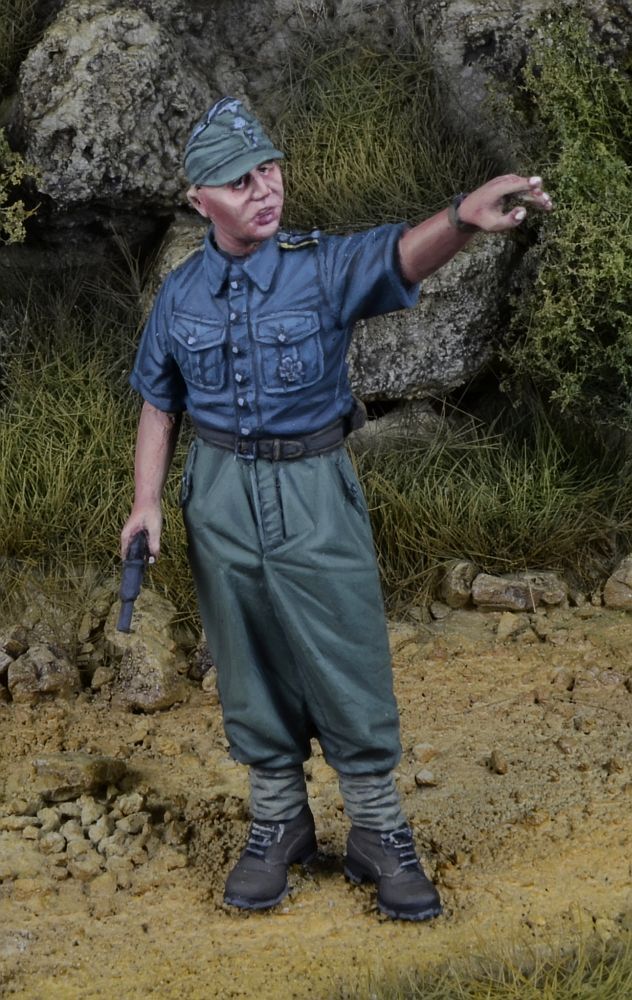 SSの記章とエーデルワイスの記章が付いた山岳帽を被り、半袖シャツ、ズボン、パテ(巻脚絆)、山岳ブーツを着用。左手で敵の陣地を指さし、右手に信号拳銃を持った立ち姿でモデル化されています。