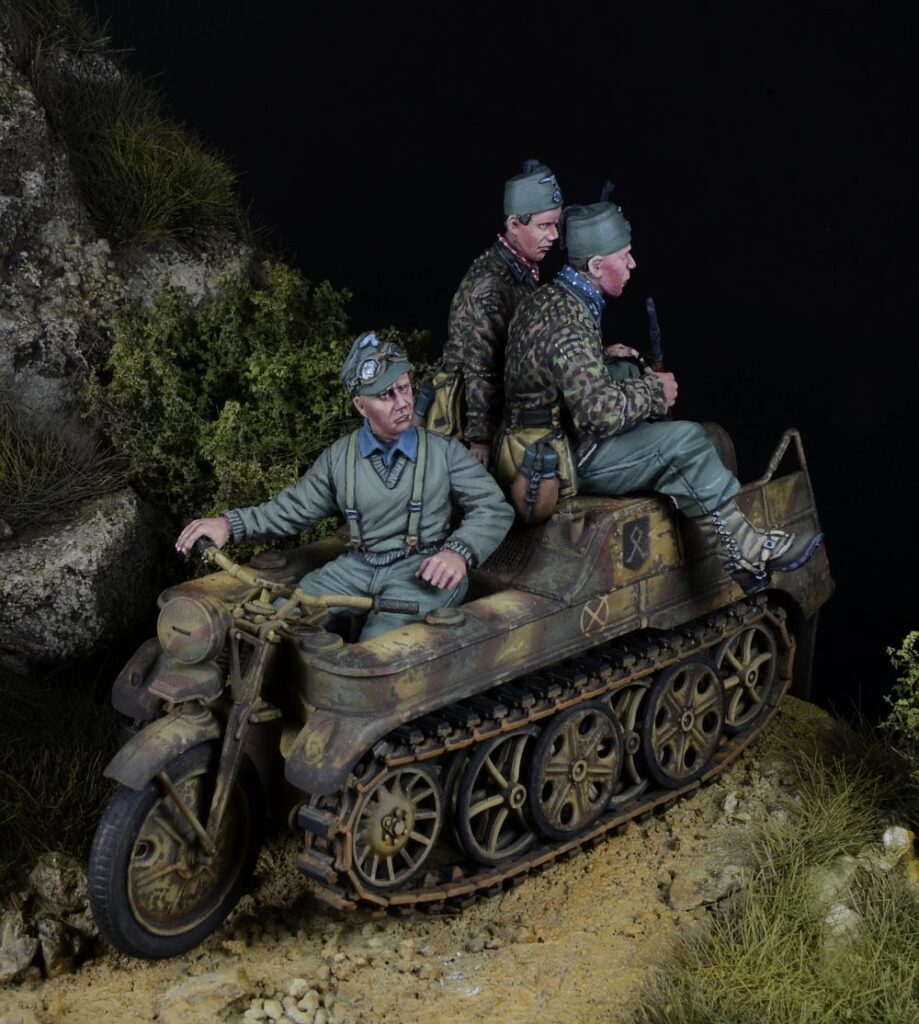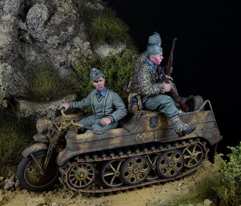 第二次大戦ドイツの武装親衛隊師団の第7SS義勇山岳師団「プリンツ・オイゲン」および第13SS武装山岳師団「ハンジャール」所属のケッテンクラート乗員を再現したレジン製フィギュアセットです。タミヤ製キットに対応します。