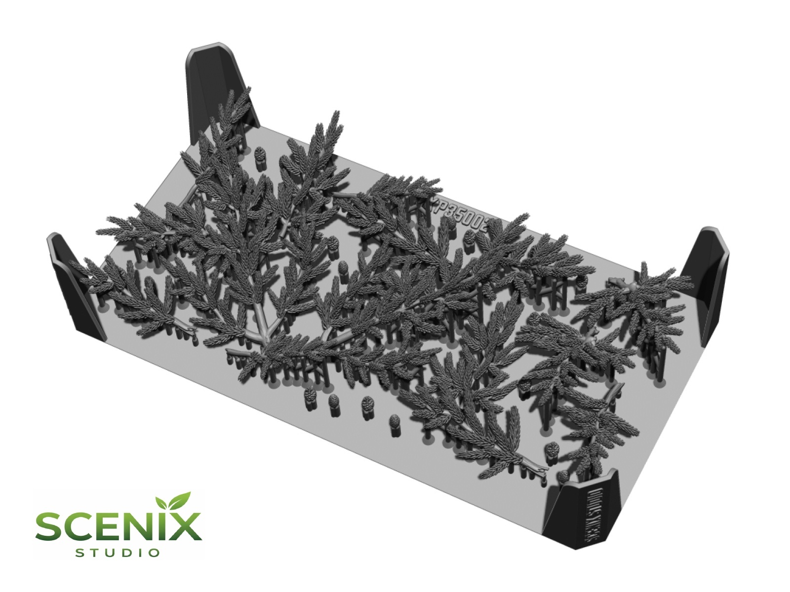 植物のモミの枝葉を再現したジオラマアクセサリーです。3Dプリントならではの高い表現力により、葉や枝を立体的かつリアルに再現しています。球果(まつぼっくり)も付属。通常の植生表現のほか、戦車や車両の偽装にも使用可能です。紙製パッケージ入(17x14.4x6cm)で、チャック付き収納袋(15x20cm)