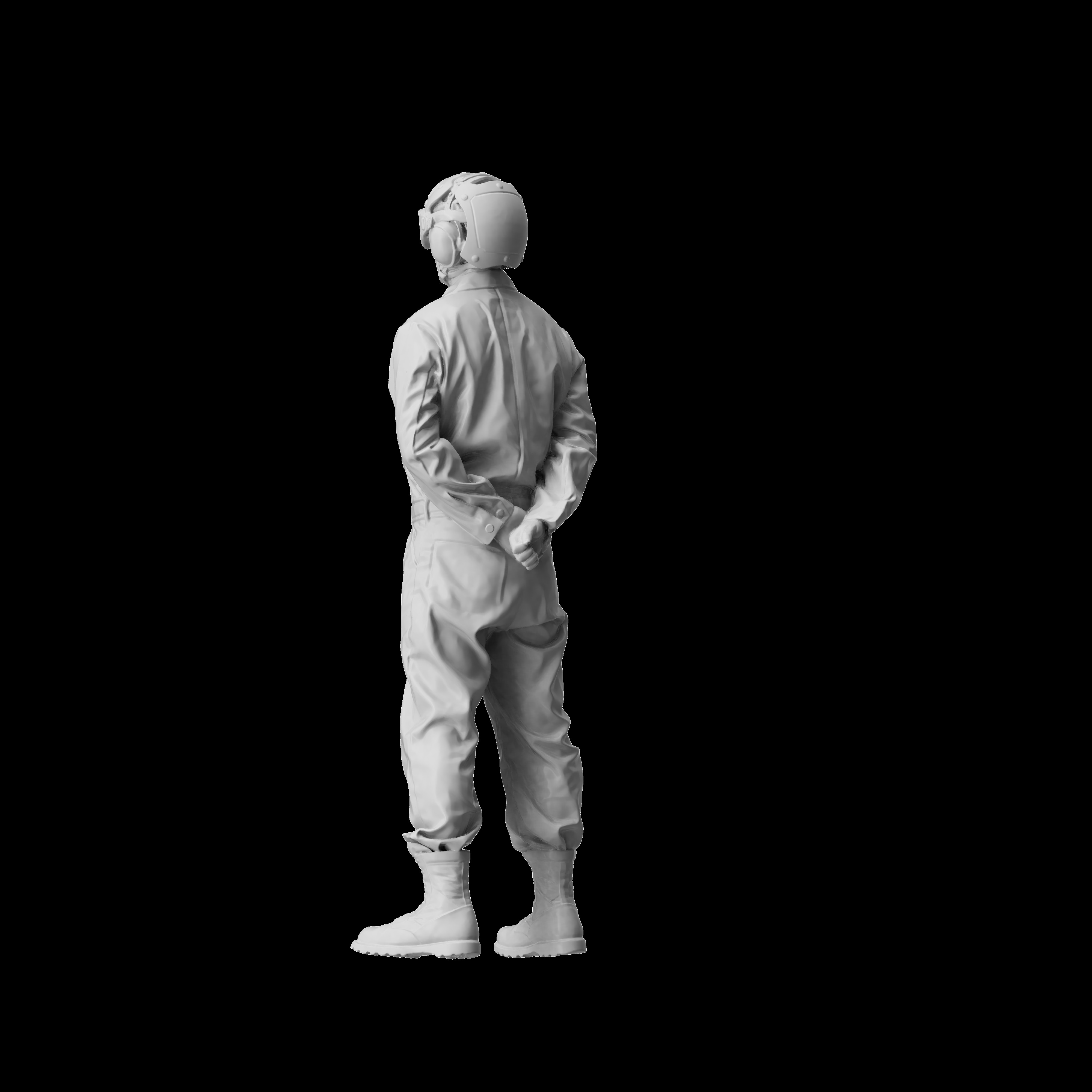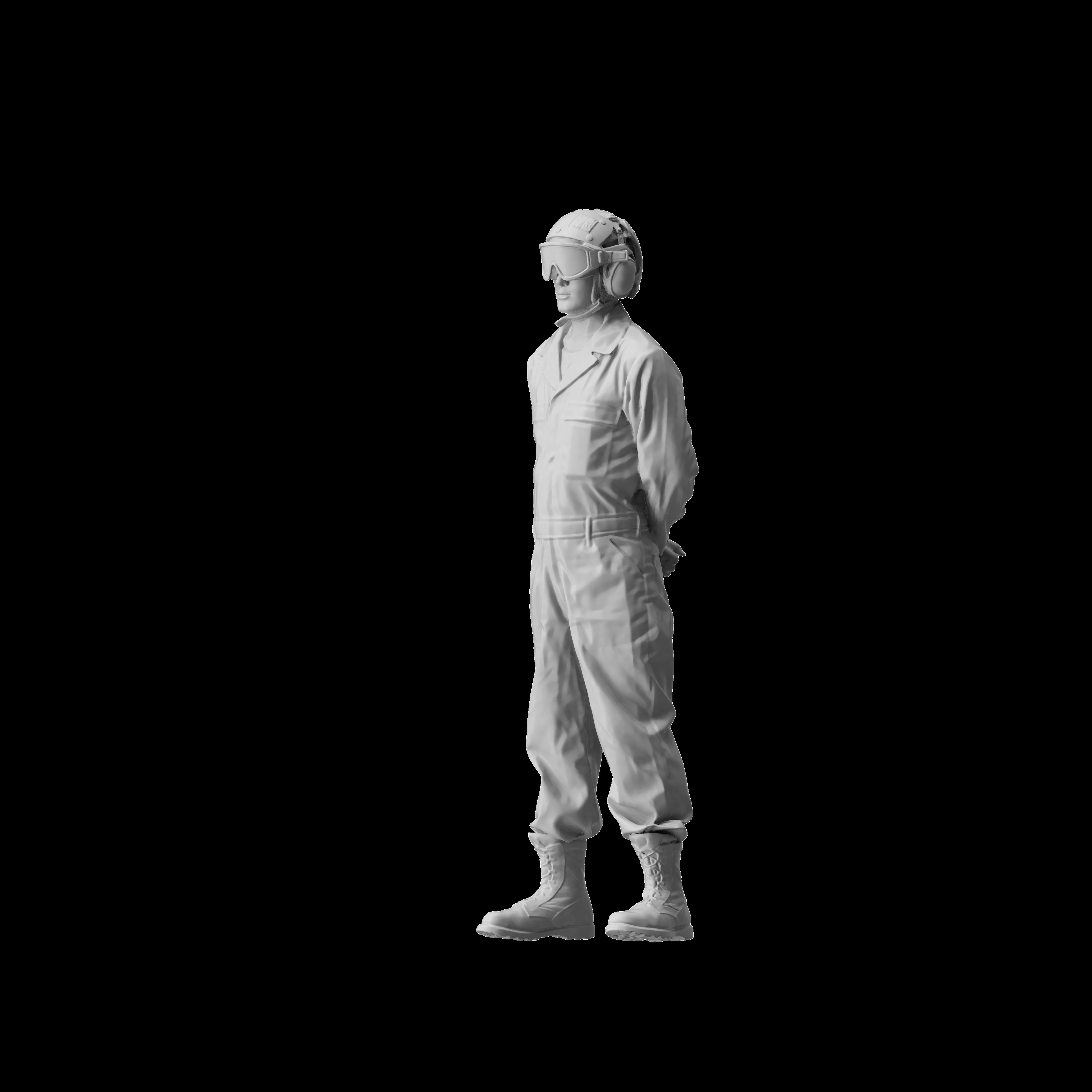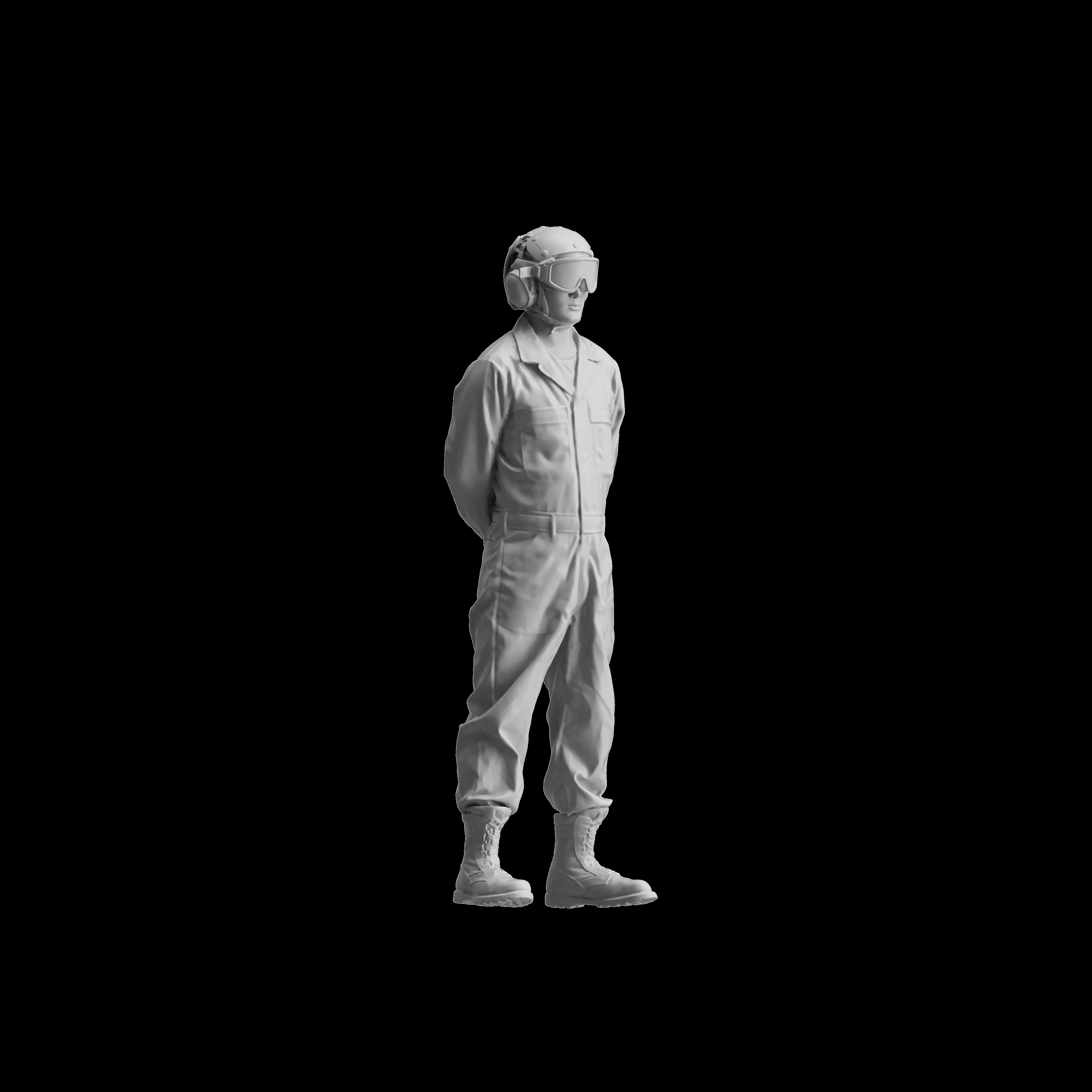 ヘルメットとイヤーマフ、ゴーグルを装着、ツナギの作業服を着て、手を後に組んで立つ姿を、3Dプリントの一体成型で精密に再現します。同スケールのAH-1Wスーパーコブラ攻撃ヘリコプターなどの傍らに配置するだけで、生き生きとしたジオラマを展開できるでしょう。