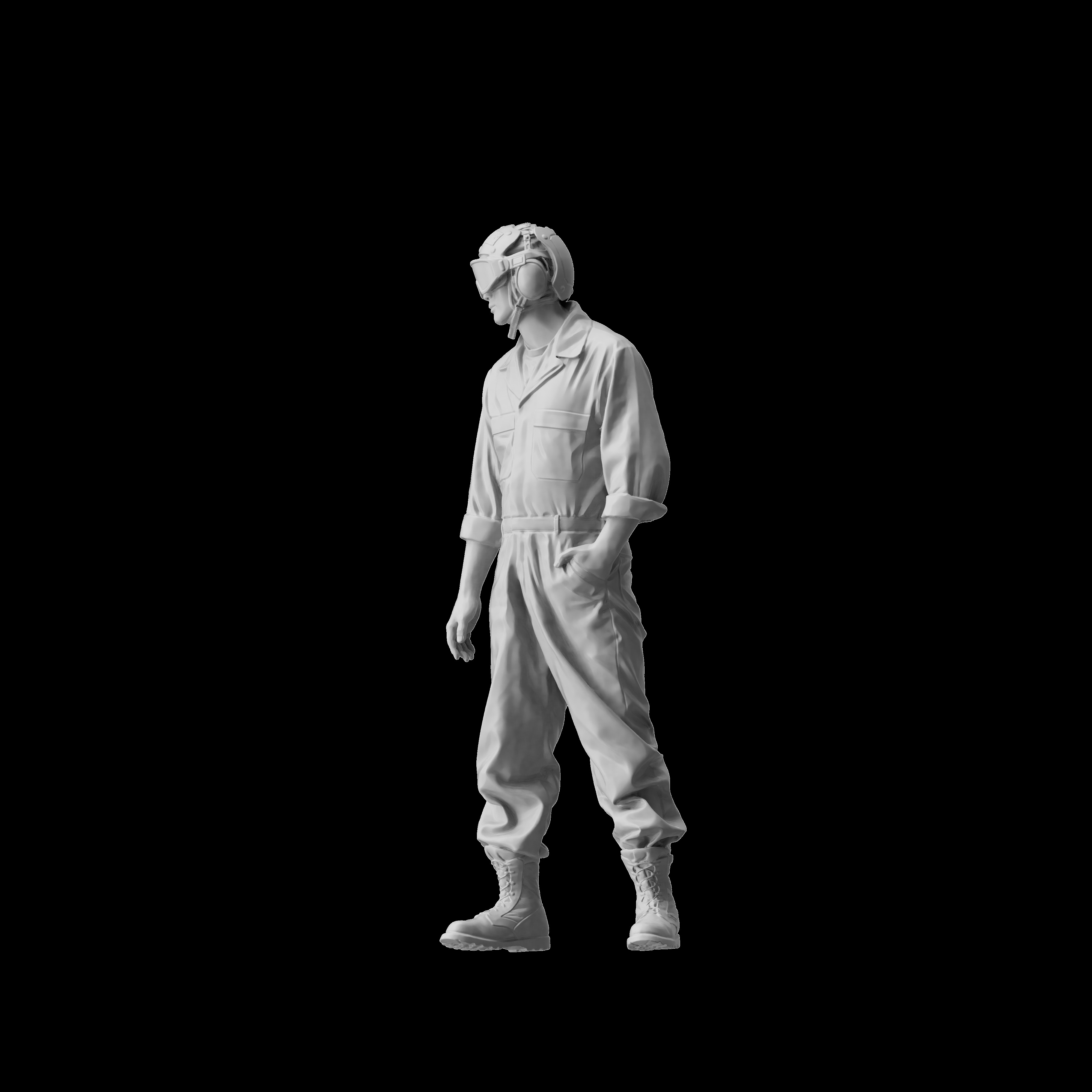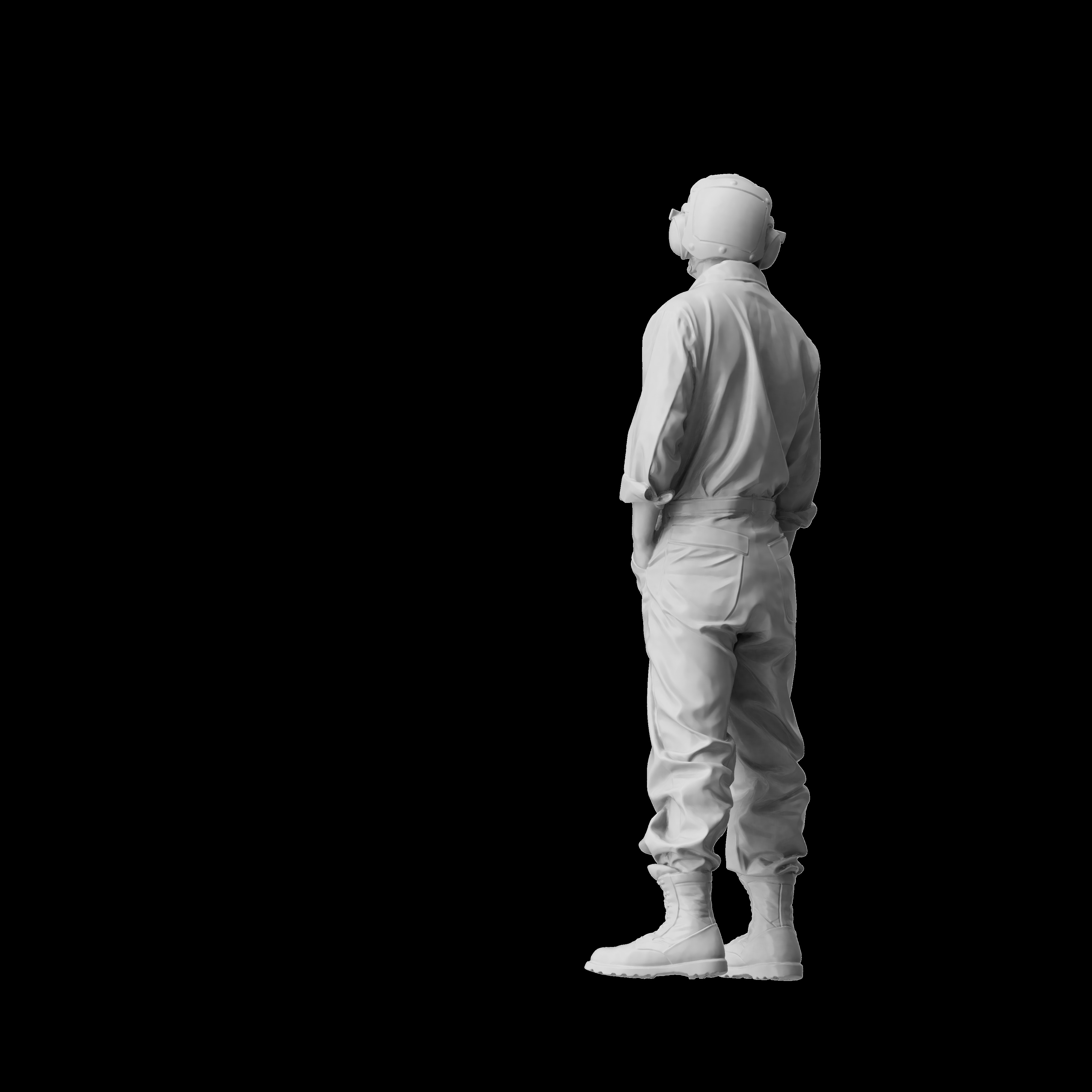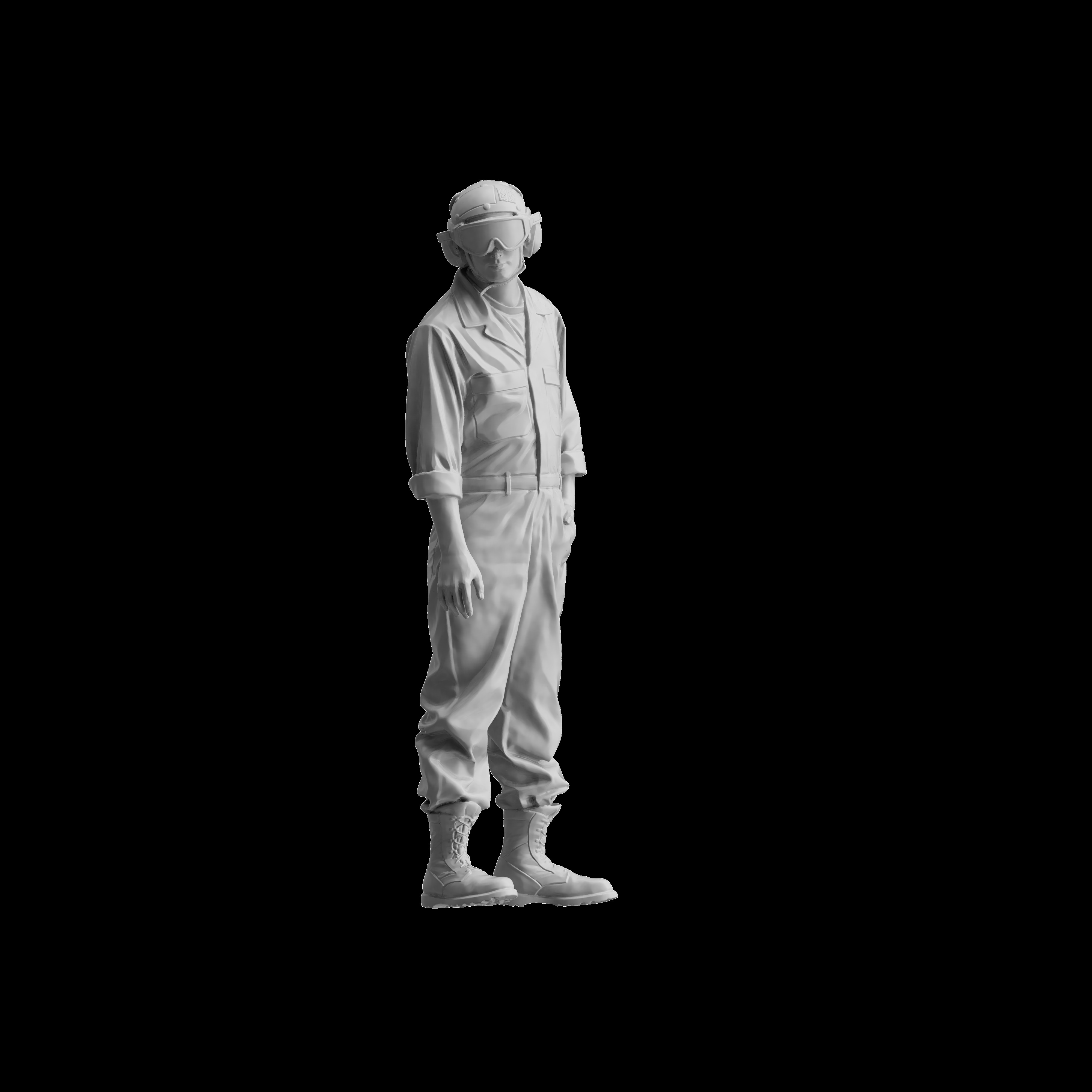 ヘルメットとイヤーマフ、ゴーグルを装着、ツナギの作業服を着て、左手をポケットに入れて右足を前に出した姿を、3Dプリントの一体成型で精密に再現します。同スケールのAH-1Wスーパーコブラ攻撃ヘリコプターなどの傍らに配置するだけで、生き生きとしたジオラマを展開できるでしょう。