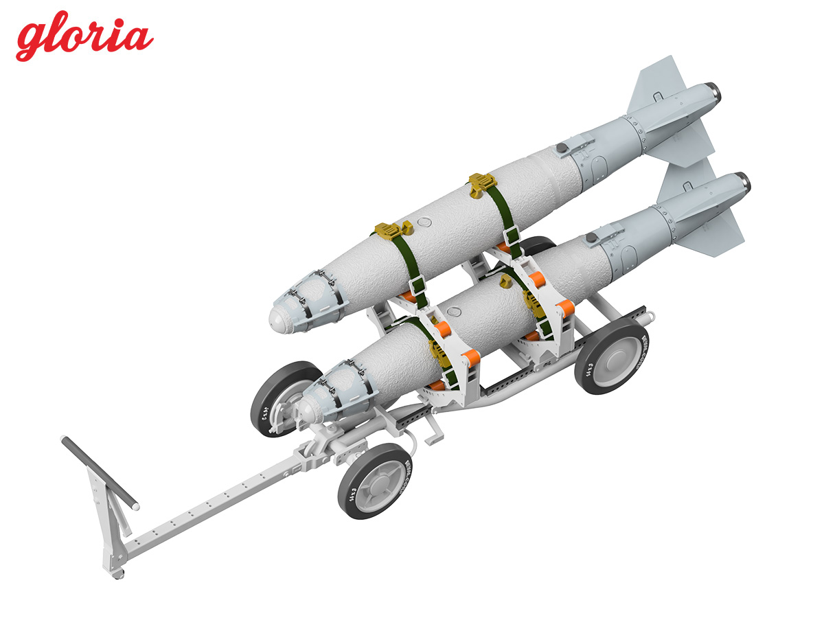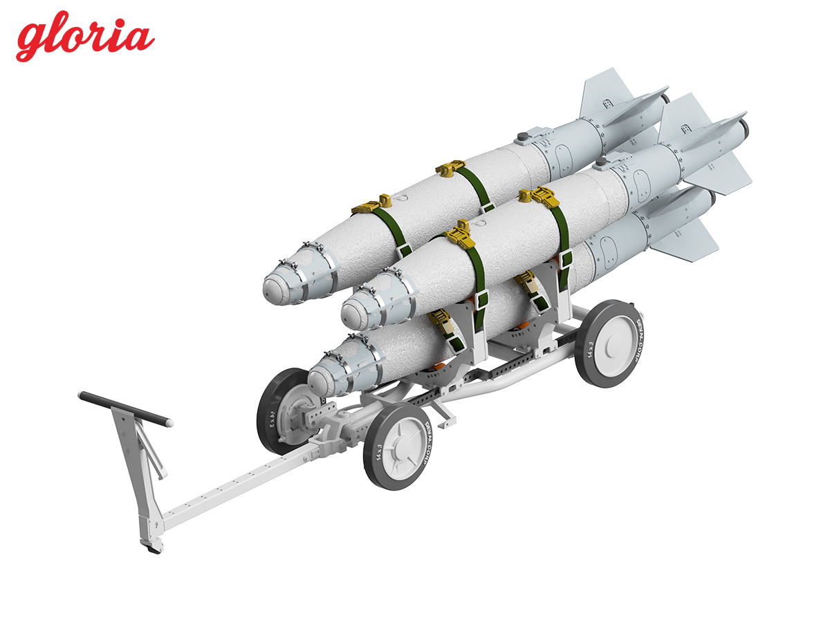 MHU-191A/Mはアダプターの装着でさまざまな弾薬に対応可能で、本製品はGBU-38 500ポンド爆弾×3発用を再現しています。輸送状態の爆弾×3発も付属します。カートの前輪の向き、牽引バーの角度、車輪の種類はそれぞれ2種類の選択式で、さまざまな状況に対応可能です。同スケールのF-4ファントムII、F-14トムキャット、F/A-18ホーネット、F-35ライトニングII、AV-8BハリアーIIなどの海軍/海兵隊機との組み合わせに最適です。