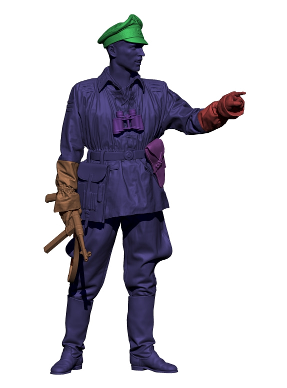 将校帽を被り、武装親衛隊用迷彩スモックと将校ズボンを着用し、右手にMP40機関短銃を持ち、左手で前方を指さして立ち、指揮を行なう将校の姿をモデル化しています。首からかけた双眼鏡、腰のピストルホルスターやマップケースなどの装備品も精密に再現しました。