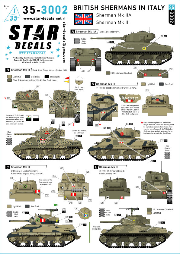 STAR DECALS[SD35-3002]1/35 WWII イギリス イタリア戦線の英軍シャーマンMk.IIA/Mk.III戦車 2 RTR/ロイヤル・スコッツ・グレイズ/44 RTR/46 RTR/第3CLY [ご注文締切日 5月1日(金)6月入荷予定]