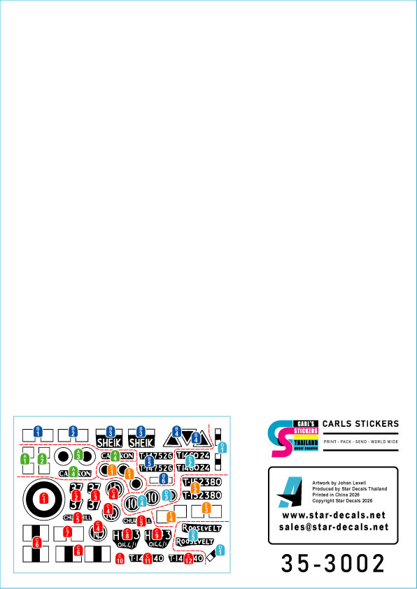 第二次大戦の1943年以降のイタリア戦線におけるイギリス陸軍のシャーマン戦車各タイプのマーキングを収録しています。Mk.IIA、Mk.IIIの2タイプから以下の部隊の計5種類をセレクトしています。