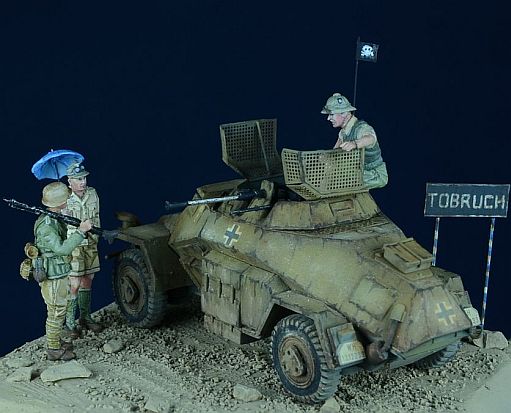 防暑帽を被った偵察部隊の兵士、MGを担いだ歩兵、日傘を差した兵士の三体セットです。四輪装甲車の他、ドラゴンが出している8輪装甲車などにもぴったりでは無いでしょうか。使ってそのままビネット仕立てになる楽しいセットです。